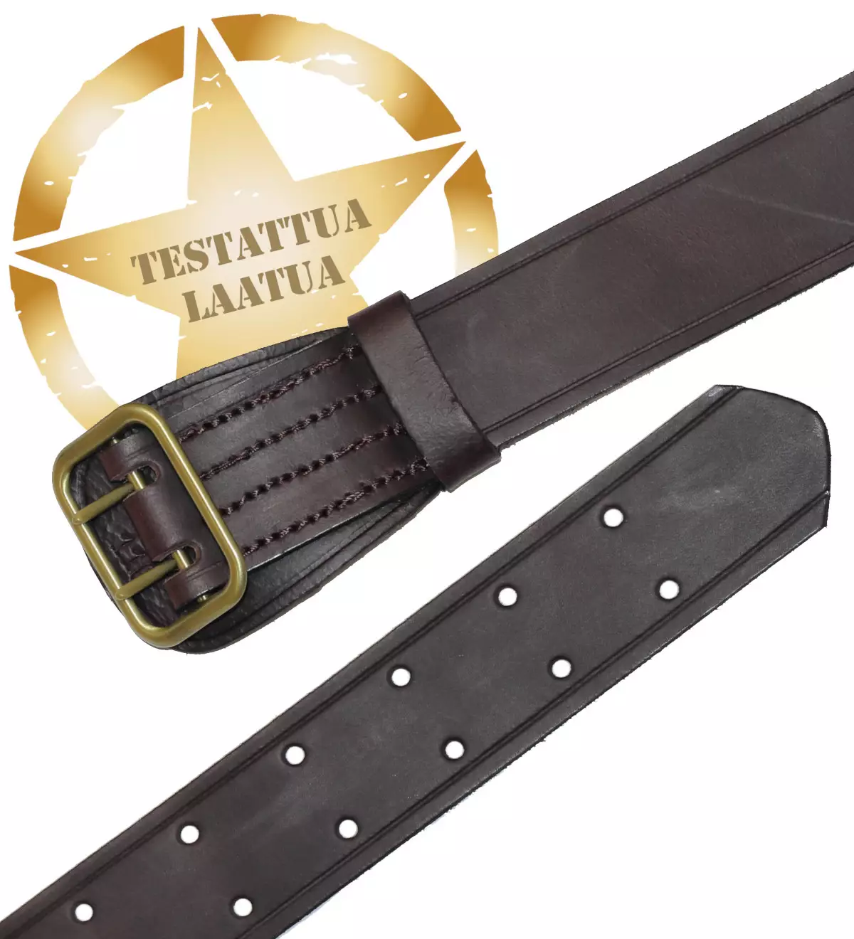 Miehistövyö 45 mm, nahkaa, ruskea. Suomen puolustusvoimien miehistövyön mallista Suomessa käsityönä valmistettu vyö. Nahan paksuus n. 3mm. Vyössä kiinteä kaksipiikkinen messinkinen vahva solki, joka valmistettu Kaukoidässä. Nahka on ulotettu soljen alle, joten solki ei paina vatsaa.